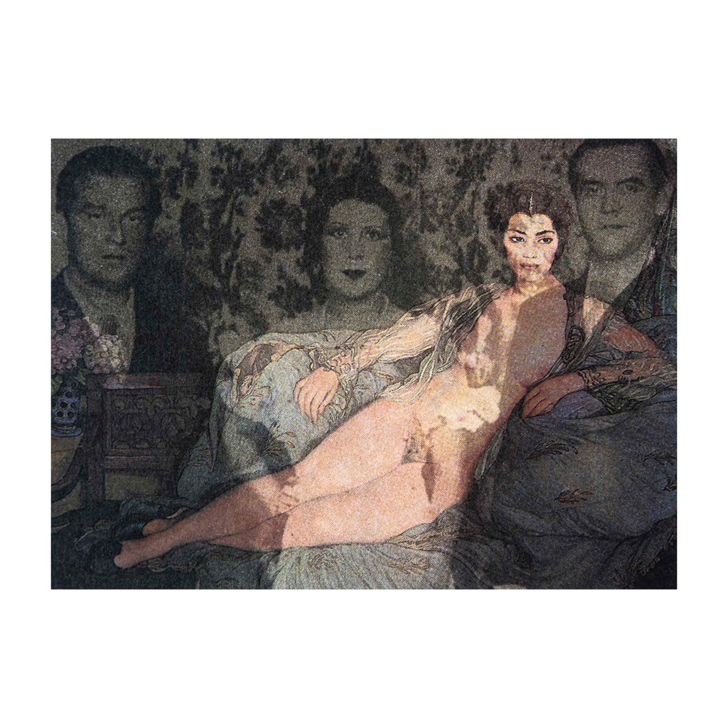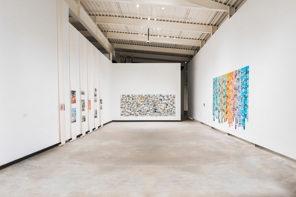 Three-piece installation with photography, digital image, AI, one-channel video and collages on mirrors [Instalación de tres piezas con fotografía, imagen digital, AI, video de un canal y collages sobre espejos].
