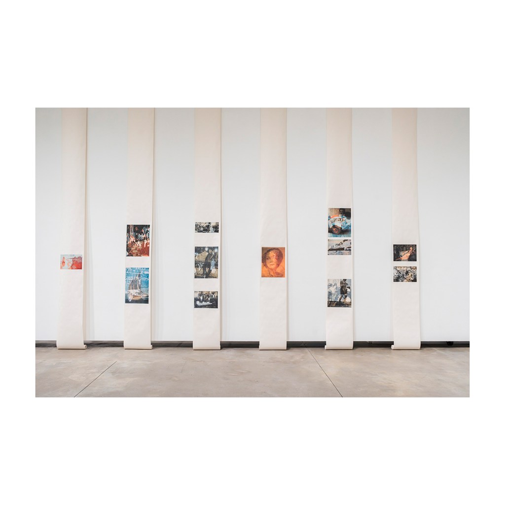 The interdisciplinary installation Crónica de una Disección de Maravillas is composed of three pieces. The first, Maravillas Naturales del Mundo, emerges from 197 landscape photographs extracted from the encyclopedia. I organized all the images according to their colour palettes and digitized them. Through algorithmic digital processes, the average of the pixels of each image was calculated to obtain a solid colour, thus annulling the formal value of colour and reducing each landscape to a single tone. Then, to abstract form, I merged the images using GAN-based AI, combining one with another and then blending the result with the next, and so on. This process generated new interpretations of the landscapes, new geographies, viewpoints, and ways of seeing native to other lens-based technologies. As a consequence, photography ceases to be a stable object and shifts toward more mutable, ephemeral, and relational forms (Concha, 2011, pp.18–19), existing more as process than as document. In the second piece, Crónicas del Siglo XX, the publication’s thin pages are photographed over a lightbox, revealing the palimpsest of information between the recto and verso of the paper, alluding to what remains hidden in twentieth-century history. The images are printed on long, thin rolls of paper. This process interrupts the chronology and the informative character of the original layout. The third piece, Maravillas Naturales del Mundo + Crónicas del Siglo XX, merges both encyclopedias into 197 collages made with the original pages, exploring the tension between space (nature) and time (history) as a single entity: spacetime. From a perspective inspired by Karen Barad (Barad, 2007, p.224), spacetime is not a passive background but a material-discursive practice in constant becoming, where images actively participate in its configuration. These collages are suspended on a mirrored wall that reflects the gesture of forcibly assembling the montages.