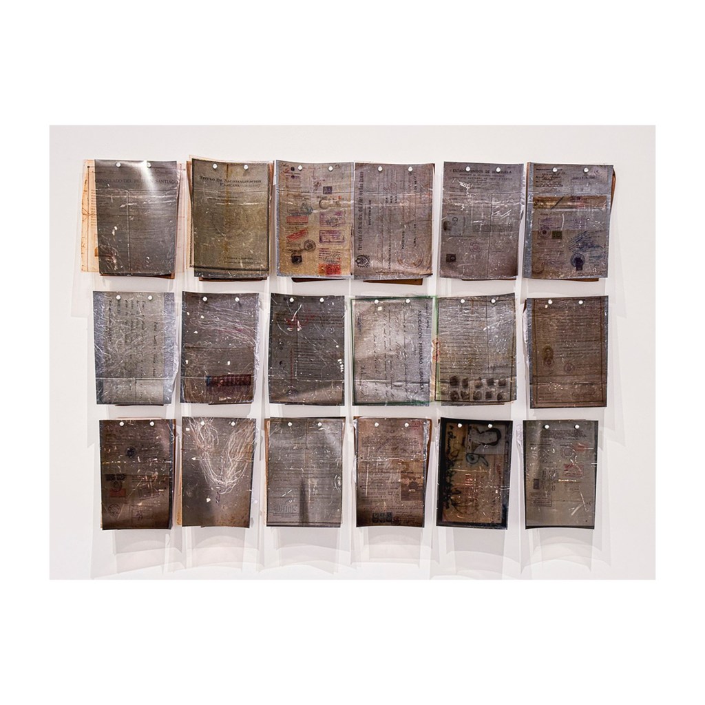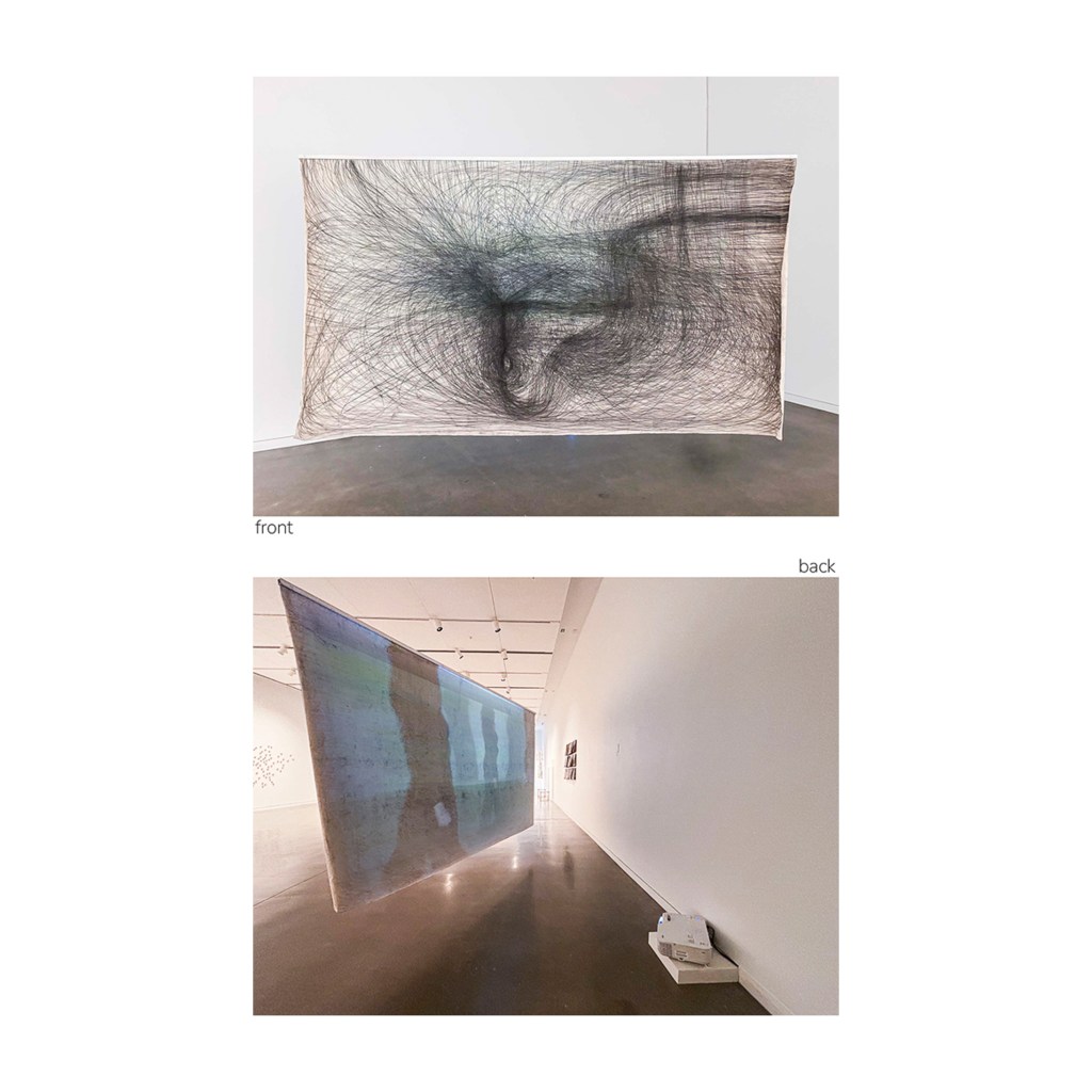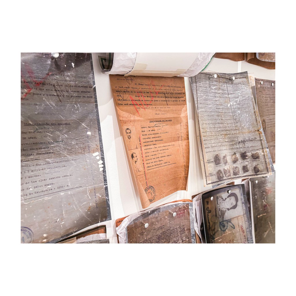 The intersdisciplinary installation Laisser-Passer [Let Pass] explores, through a personal and family narrative, the first waves of migration from the Arab community to Latin America in the late 19th and early 20th centuries. The French term «Laisser-Passer», historically used as a «free passage» visa for migrants, appears in my family documents. The work consists of a performative video projected on the back of a 13.1 by 5.9-foot floating canvas. On this surface, I have traced an innumerable amount of speculative and expansive routes of my ancestors and my own path. The video reproduces a high-pitched noise, obtained from the recording of the empty room. This sounds activates an uncomfortable feeling of absence that hums in the brain and the heart. The distance between the projection from the floor to the canvas allows viewers to walk in front of the projector, thus casting their shadow on the video, in which my walk and my family are unified with the migratory stories of many other people. A photograph of the palm of my hand taken after completing the traces on the canvas, the documentation of a performative act in which I scrape the speculative routes onto a black wall with my knuckles, and a layout that conglomerates migratory documents, drawings and family archive photographs, are also part of the installation.